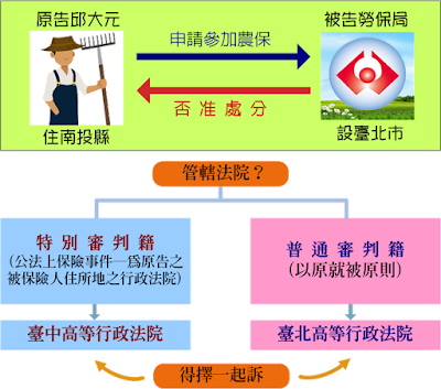 就本件來說,邱大元要提起行政訴訟,若依照普通審判籍規定,可以向勞保局機關所在地臺北市轄區之行政法院,就是臺北高等行政法院提起行政訴訟;若依照特別審判籍規定,可以向邱大元住所地南投縣轄區之行政法院,就是臺中高等行政法院提起行政訴訟。因為臺北高等行政法院及臺中高等行政法院都具有管轄權,邱大元可以自由選擇向其中一個行政法院起訴。當然,邱大元若選擇向比較近的臺中高等行政法院(或南投地方法院行政訴訟庭)起訴,對他比較有利,這也是立法者訂定特別審判籍保障人民的目的。(106年5月編寫)